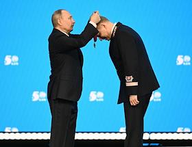 Мероприятие, посвященное празднованию 50-летия начала строительства Байкало-Амурской магистрали (БАМ), в Кремлевском дворце. Президент России Владимир Путин (слева) и президент ООО "Бамовское содружество" Ефим Басин (справа) во время церемонии вручения государственных наград.