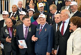Мероприятие, посвященное празднованию 50-летия начала строительства Байкало-Амурской магистрали (БАМ), в Кремлевском дворце. Заместитель председателя Государственной думы России Сергей Неверов (слева) и президент некоммерческой организации "Благотворительный фонд", президент нефтегазового концерна "Би-Газ-Си" Александр Воловик (справа) во время мероприятия.