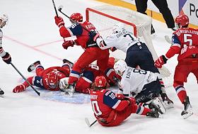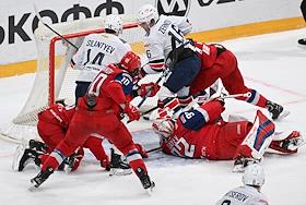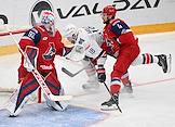 Континентальная хоккейная лига (КХЛ). Чемпионат сезона 2022/23. Плей-офф Кубка Гагарина. Финал. 4-й матч между командами "Локомотив" (Ярославль) - "Металлург" (Магнитогорск) на стадионе "Арена-2000-Локомотив". Слева направо: вратарь команды "Локомотив" Даниил Исаев, игрок команды "Металлург" Павле Акользин и игрок команды "Локомотив" Александр Елесин во время матча.