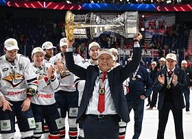 Континентальная хоккейная лига (КХЛ). Чемпионат сезона 2022/23. Плей-офф Кубка Гагарина. Финал. 4-й матч между командами "Локомотив" (Ярославль) - "Металлург" (Магнитогорск) на стадионе "Арена-2000-Локомотив". Главный тренер команды "Металлург" Андрей Разин (в центре) с Кубком Гагарина после матча.
