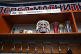 Континентальная хоккейная лига (КХЛ). Чемпионат сезона 2022/23. Плей-офф Кубка Гагарина. Финал. 4-й матч между командами "Локомотив" (Ярославль) - "Металлург" (Магнитогорск) на стадионе "Арена-2000-Локомотив". Жанровая фотография. Полка в раздевалке вратаря команды "Металлург" Ильи Набокова.