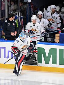 Континентальная хоккейная лига (КХЛ). Чемпионат сезона 2022/23. Плей-офф Кубка Гагарина. Финал. 4-й матч между командами "Локомотив" (Ярославль) - "Металлург" (Магнитогорск) на стадионе "Арена-2000-Локомотив". Игроки команды "Металлург" во время матча.