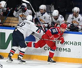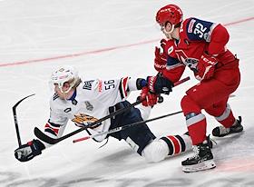 Континентальная хоккейная лига (КХЛ). Чемпионат сезона 2022/23. Плей-офф Кубка Гагарина. Финал. 4-й матч между командами "Локомотив" (Ярославль) - "Металлург" (Магнитогорск) на стадионе "Арена-2000-Локомотив". Игрок команды "Металлург" Макар Хабаров (слева) и игрок команды "Локомотив" Павел Красковский (справа) во время матча.