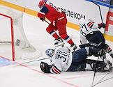 Континентальная хоккейная лига (КХЛ). Чемпионат сезона 2022/23. Плей-офф Кубка Гагарина. Финал. 4-й матч между командами "Локомотив" (Ярославль) - "Металлург" (Магнитогорск) на стадионе "Арена-2000-Локомотив". Вратарь команды "Металлург" Илья Набоков (справа) и игрок команды "Локомотив" Ярослав Лихачев (слева) во время матча.
