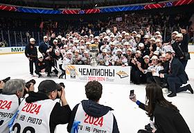 Континентальная хоккейная лига (КХЛ). Чемпионат сезона 2022/23. Плей-офф Кубка Гагарина. Финал. 4-й матч между командами "Локомотив" (Ярославль) - "Металлург" (Магнитогорск) на стадионе "Арена-2000-Локомотив". Игроки и тренеры команды "Металлург" с Кубком Гагарина после матча.