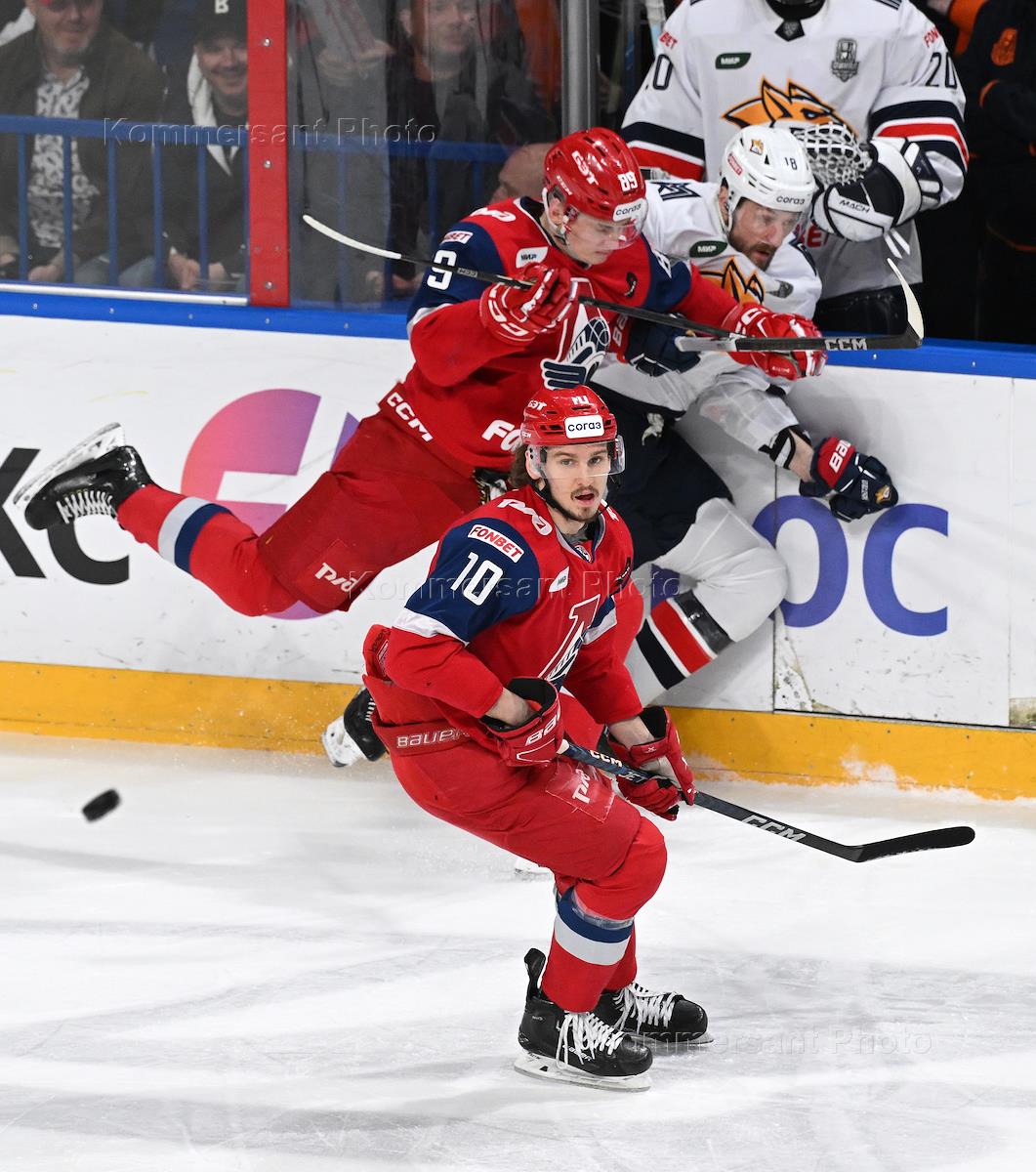 Континентальная хоккейная лига (КХЛ). Чемпионат сезона 2022/23. Плей-офф Кубка Гагарина. Финал. 4-й матч между командами "Локомотив" (Ярославль) - "Металлург" (Магнитогорск) на стадионе "Арена-2000-Локомотив". Игроки команды "Локомотив" Павел Красковский (слева) и Даниил Тесанов (в центре) во время матча.