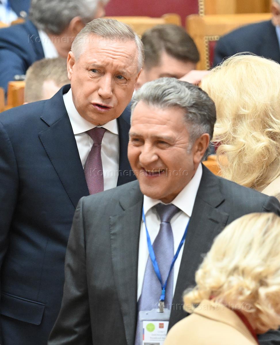 Рабочая поездка президента России Владимир Путина в Санкт-Петербург. Заседание Совета законодателей России в Таврическом дворце. Председатель законодательного собрания Новосибирской области Андрей Шимкив (справа) и губернатор Санкт-Петербурга Александр Беглов (слева) во время заседания.