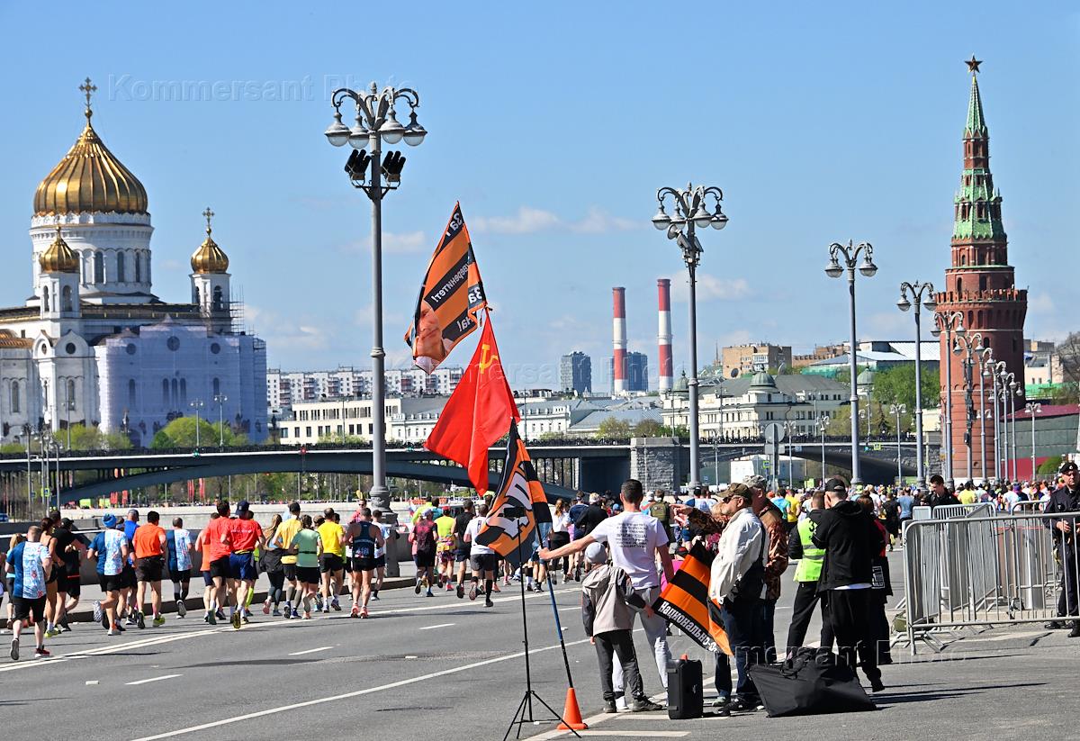 Юбилейный 10-й Московский полумарафон. Забег на 21,1 км. Старт и финиш на территории Олимпийского комплекса "Лужники", маршрут проходит в один круг по набережным Лужнецкой, Фрунзенской, Пречистенской, Кремлёвской, Котельнической и Краснохолмской. Зрители с флагом Национального освободительного движения (НОД) во время забега.