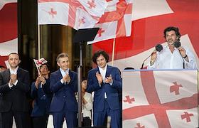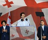 Митинг партии "Грузинская мечта" в поддержку законопроекта "О прозрачности иностранного влияния" ("об иноагентах"). Слева направо: политик Ираклий Гарибашвили, политик, бизнесмен Бидзина Иванишвили, премьер-министр Грузии Ираклий Кобахадзе и мэр Тбилиси Каха Каладзе на митинге.