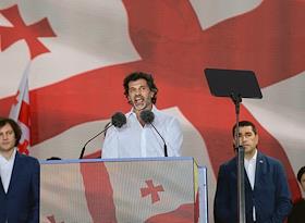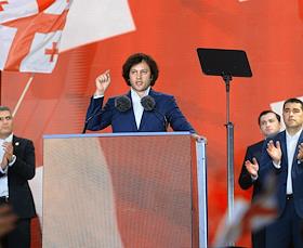 Митинг партии "Грузинская мечта" в поддержку законопроекта "О прозрачности иностранного влияния" ("об иноагентах"). Премьер-министр Грузии Ираклий Кобахидзе на митинге.