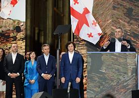 Митинг партии "Грузинская мечта" в поддержку законопроекта "О прозрачности иностранного влияния" ("об иноагентах"). Премьер-министр Грузии Ираклий Кобахидзе (слева) и мэр Тбилиси Каха Каладзе (в центре) на митинге.