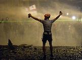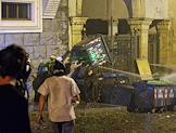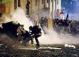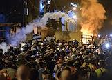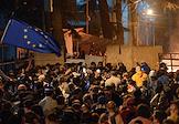 Участники акция протеста против принятия закона об иноагентах у здания парламента Грузии во время столкновения с полицией.