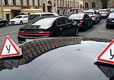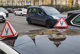 Жанровая фотография. Два знака "Учебный автомобиль" на стеклянной крыше машины, припаркованной на улице.