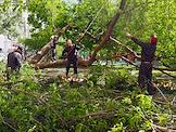 Жанровая фотография. Работники ЖКС проводят спил дерева, признанного муниципальными службами аварийным и опасным во дворе жилого дома.