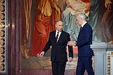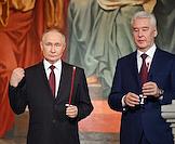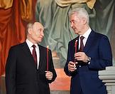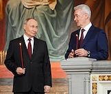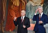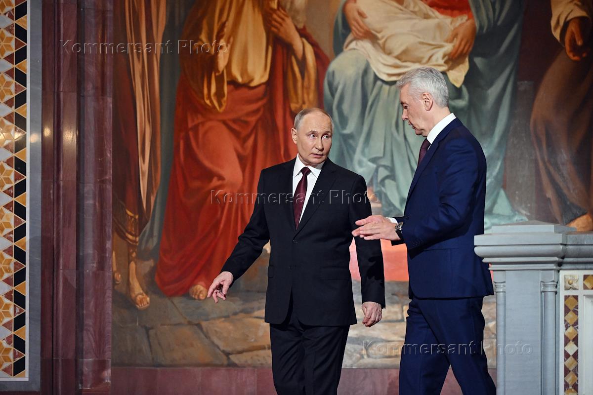 Праздничное Пасхальное богослужение в кафедральном соборном храме Христа Спасителя. Президент России Владимир Путин (слева) и мэр Москвы Сергей Собянин (справа) перед началом пасхальной службы.