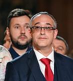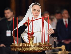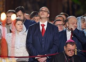 Праздничное Пасхальное богослужение в кафедральном соборном храме Христа Спасителя. Председатель Либерально-демократическая партия России (ЛДПР), руководитель фракции ЛДПР в Государственной думе России Леонид Слуцкий во время пасхальной службы.