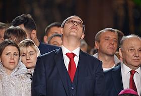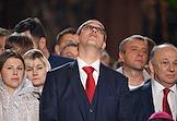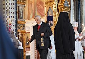 Праздничное Пасхальное богослужение в кафедральном соборном храме Христа Спасителя. Председатель Московской городской думы Алексей Шапошников во время пасхальной службы.