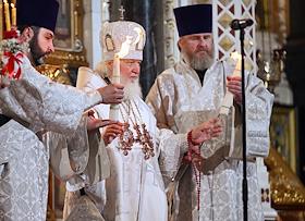 Праздничное Пасхальное богослужение в кафедральном соборном храме Христа Спасителя. Патриарх Московский и Всея Руси Кирилл во время пасхальной службы.