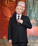 Праздничное Пасхальное богослужение в кафедральном соборном храме Христа Спасителя. Президент России Владимир Путин (слева) и мэр Москвы Сергей Собянин (справа) во время пасхальной службы.