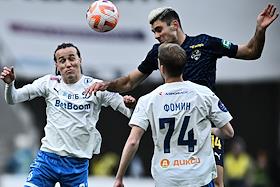 Российская Премьер-Лига (РПЛ). MИР - Чемпионат России по футболу 2023/2024. 27-й тур. Матч между командами "Динамо" (Москва) - "Сочи" (Сочи) на стадионе "ВТБ Арена". Вратарь команды "Сочи" Максим Рудаков (второй слева) и игрок команды "Динамо" Константин Тюкавин (слева) во время матча.