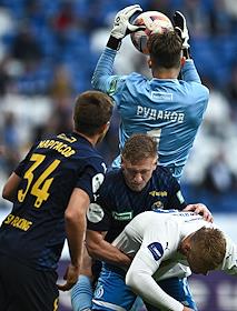 Российская Премьер-Лига (РПЛ). MИР - Чемпионат России по футболу 2023/2024. 27-й тур. Матч между командами "Динамо" (Москва) - "Сочи" (Сочи) на стадионе "ВТБ Арена". Вратарь команды "Сочи" Максим Рудаков (в центре) во время матча.
