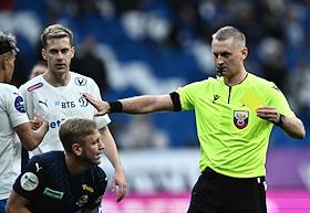 Российская Премьер-Лига (РПЛ). MИР - Чемпионат России по футболу 2023/2024. 27-й тур. Матч между командами "Динамо" (Москва) - "Сочи" (Сочи) на стадионе "ВТБ Арена". Главный судья Артем Чистяков (справа) во время матча.