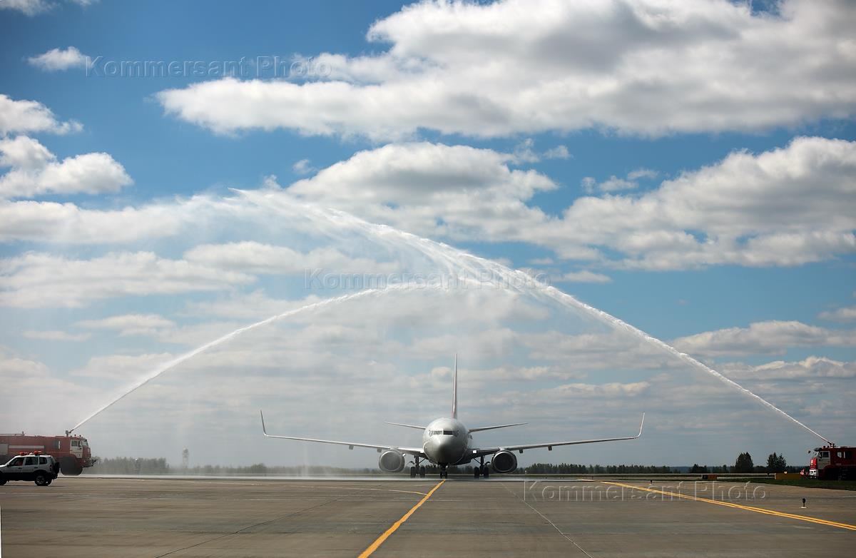 Церемония открытия первого прямого регулярного рейса по маршруту "Казань — Улан-Удэ — Казань" в международном аэропорту имени Габдуллы Тукая. Жанровая фотография. Самолет на взлетной полосе.