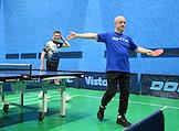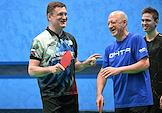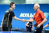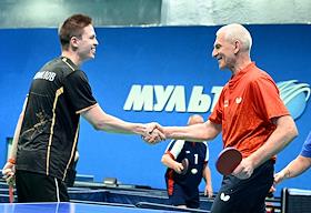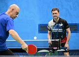 Открытый Кубок Государственной думы (ГД) России по настольному теннису в спортивном клубе "Мультиспорт" на территории Олимпийского комплекса "Лужники". Министр спорта России Олег Матыцин (справа) во время соревнований.