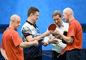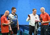Открытый Кубок Государственной думы (ГД) России по настольному теннису в спортивном клубе "Мультиспорт" на территории Олимпийского комплекса "Лужники". Слева направо: заместитель председателя ГД России Александр Бабаков, заместитель председателя Правительства России Александр Новак, первый заместитель председателя ГД России Александр Жуков и министр спорта России Олег Матыцин во время соревнований.