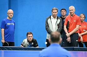 Открытый Кубок Государственной думы (ГД) России по настольному теннису в спортивном клубе "Мультиспорт" на территории Олимпийского комплекса "Лужники". Заместитель председателя ГД России Александр Бабаков (третий слева) и первый заместитель председателя ГД России Александр Жуков (второй слева) во время соревнований.