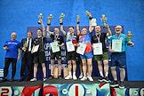Открытый Кубок Государственной думы (ГД) России по настольному теннису в спортивном клубе "Мультиспорт" на территории Олимпийского комплекса "Лужники". Участники во время церемонии награждения.