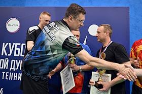 Открытый Кубок Государственной думы (ГД) России по настольному теннису в спортивном клубе "Мультиспорт" на территории Олимпийского комплекса "Лужники". Заместитель председателя Правительства России Александр Новак (справа) во время церемонии награждения.