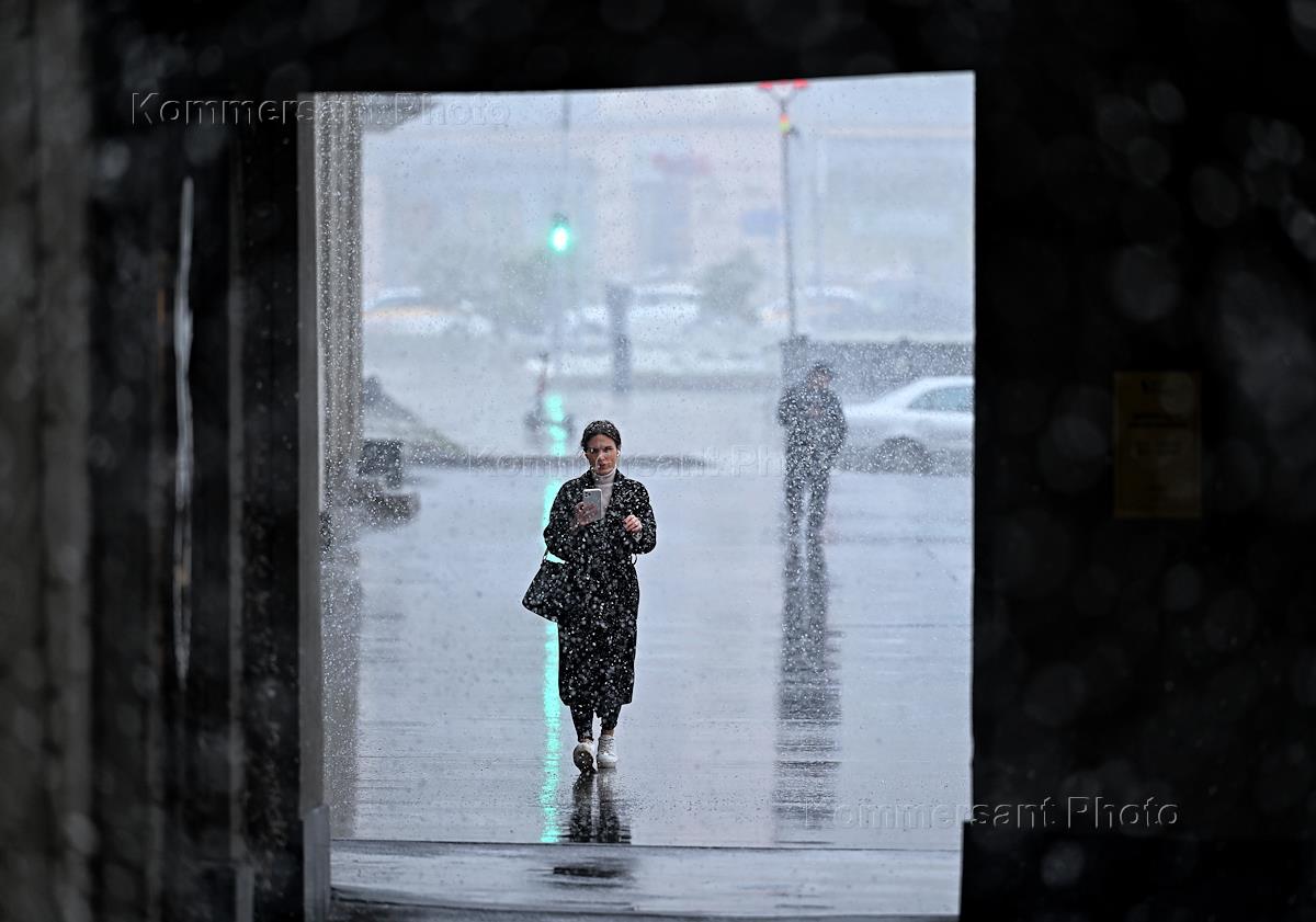 Снегопад в Москве. Жанровая фотография. Прохожие на улице во время снегопада.