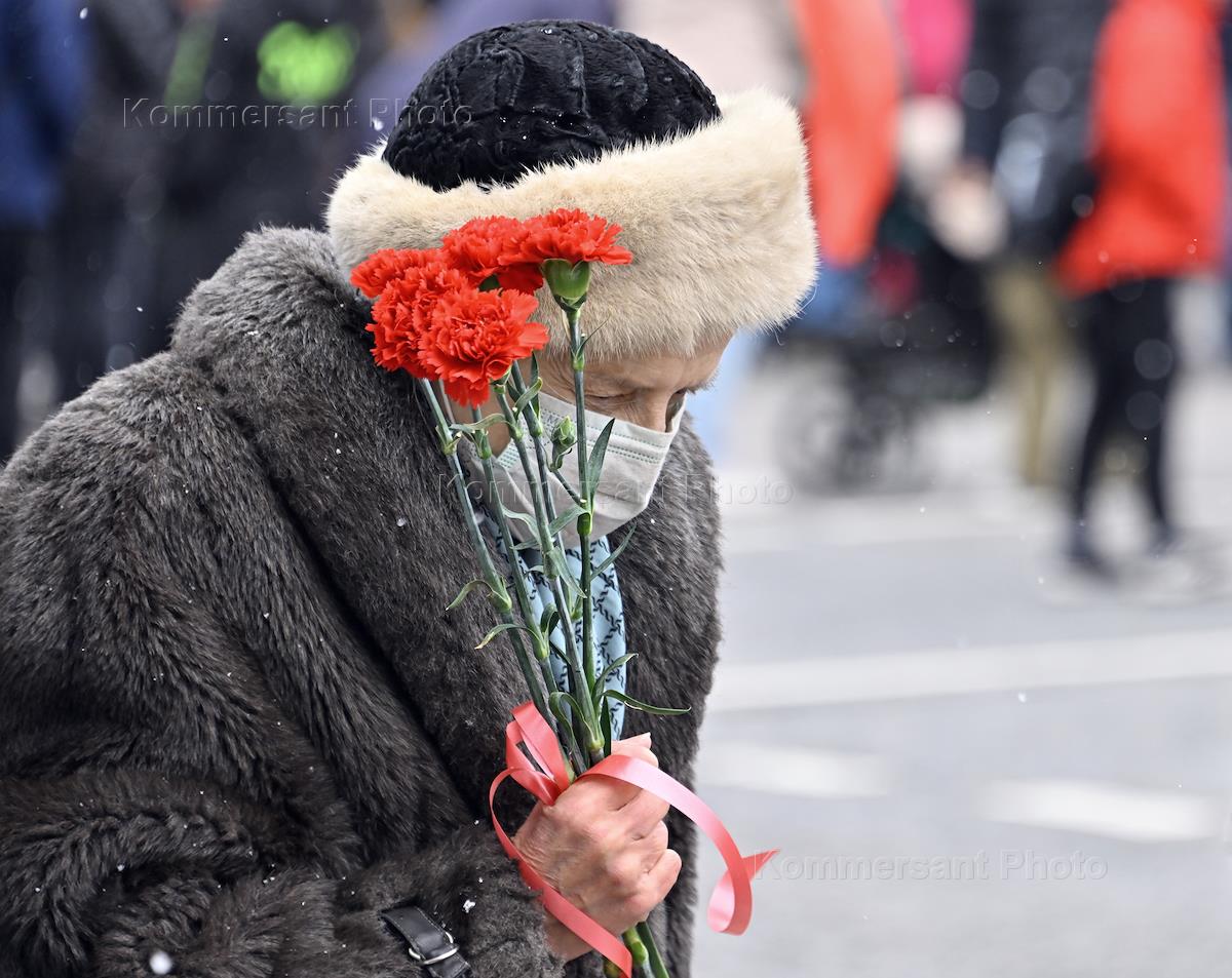 Военный парад на Красной площади, посвященный 79-ой годовщине Победы в Великой Отечественной войне. Пожилая женщина с цветами во время парада.