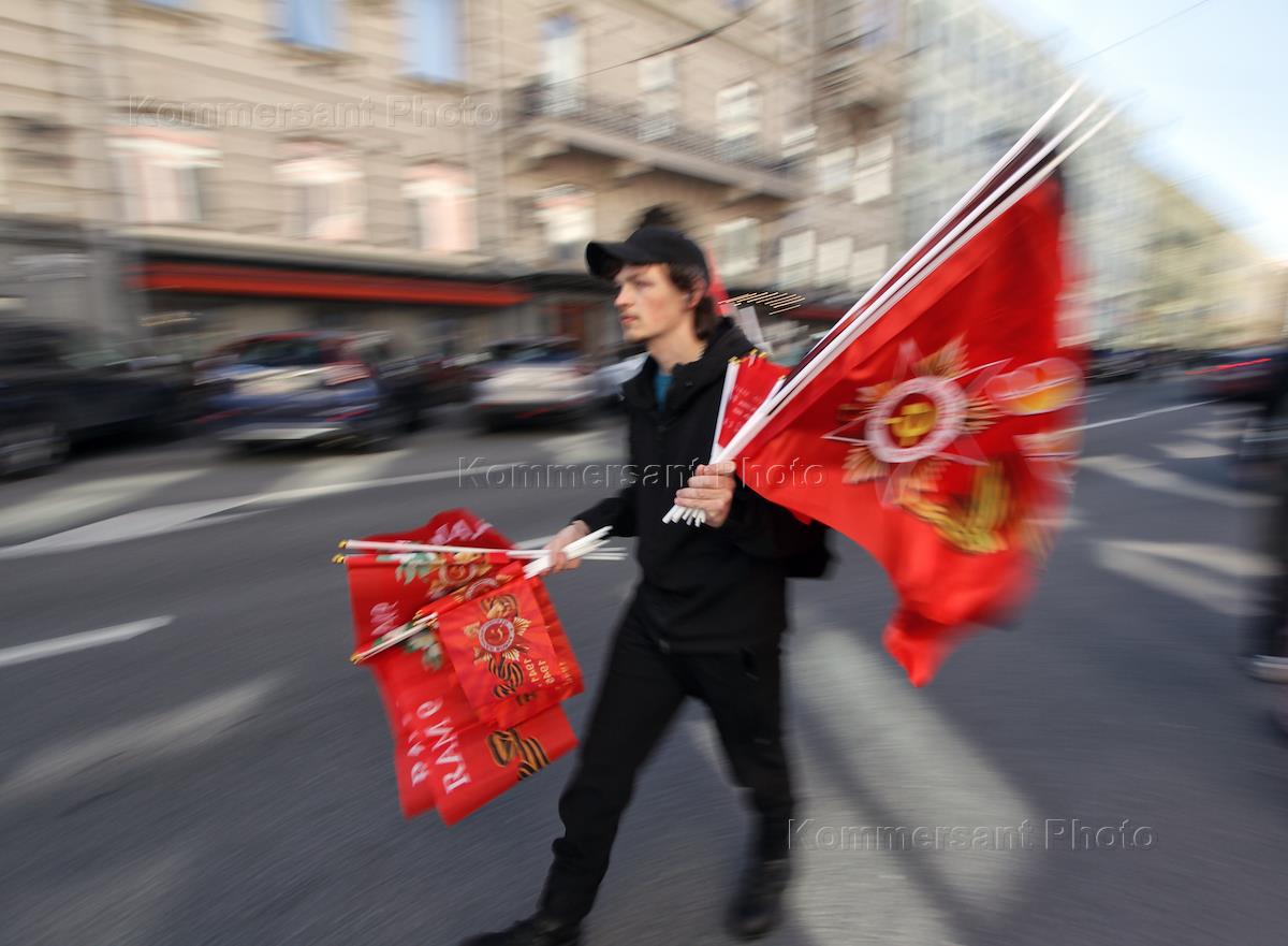 Празднование 79-й годовщины Победы в Великой Отечественной войне в городе. Молодой человек с флажками на улице.