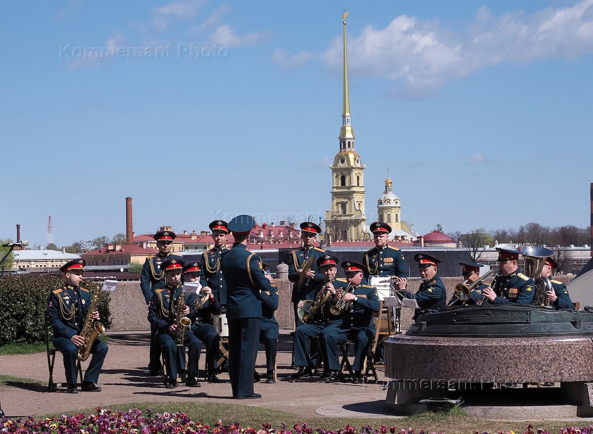 Празднование 79-ой годовщины Победы в Великой Отечественной войне на улицах города. Музыканты военного духового оркестра во время выступления.