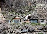 Виды Армении. Жанровая фотография. Пасечник собирает мед в ульях.