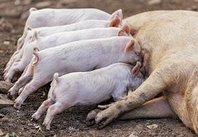 Сельскохозяйственные животные. Свинья кормит поросят. Жанровая фотография.