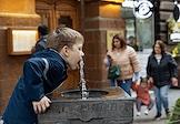 Виды Еревана. Жанровая фотография. Ребенок пьет воду из питьевого фонтанчика.