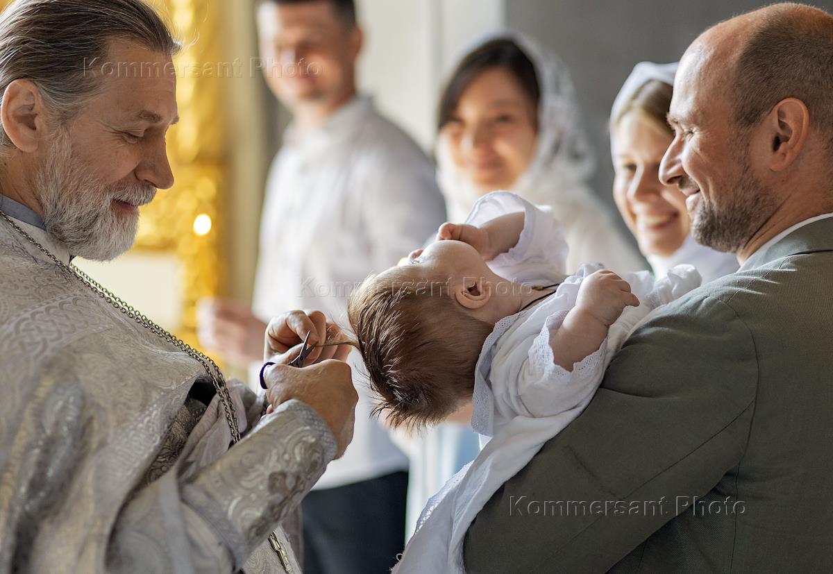 Жанровая фотография. Обряд крещения. Священник православной церкви во время крещения младенца.