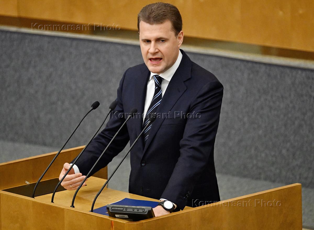 Пленарное заседание Государственной думы (ГД) России. Кандидат на должность министра промышленности и торговли России Антон Алиханов (в центре) во время заседания.