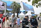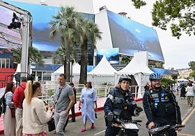 77-й международный Каннский кинофестиваль / Festival de Cannes 2024. День первый. Жанровая фотография. Прохожие и сотрудники полиции возле здания Дворца фестивалей и конгрессов на набережной Круазет.
