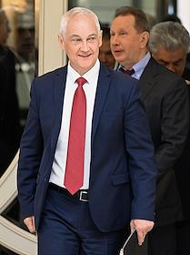 An extraordinary meeting of the Federation Council (FC) of Russia to discuss candidates for the posts of heads of the Russian law enforcement agencies and the Russian Ministry of Foreign Affairs. Candidate for the post of Russian Defense Minister Andrei Belousov (left) and representative to the Federation Council of Russia from the executive body of state power of the Kirov region Viktor Bondarev (center) before the start of the meeting.