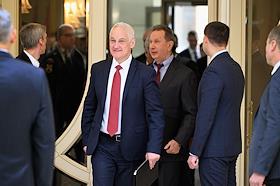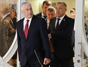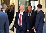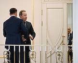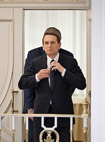 An extraordinary meeting of the Russian Federation Council to discuss candidates for the posts of heads of law enforcement agencies and the Russian Ministry of Foreign Affairs. Candidate for the post of manager of the Foreign Intelligence Service Sergei Naryshkin (right) before the start of the meeting.