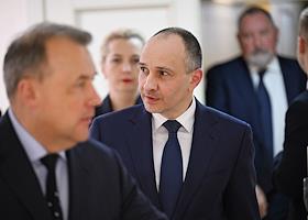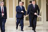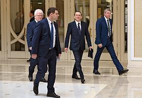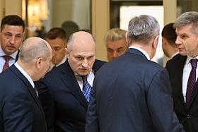 An extraordinary meeting of the Federation Council (FC) of Russia to discuss candidates for the posts of heads of law enforcement agencies of Russia and the Ministry of Foreign Affairs of Russia. Candidate for the post of Chairman of the Accounts Chamber of Russia Boris Kovalchuk (center) and Deputy Chairman of the Federation Council of Russia Nikolai Zhuravlev (right) before the start of the meeting.