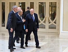 An extraordinary meeting of the Federation Council (FC) of Russia to discuss candidates for the posts of heads of law enforcement agencies of Russia and the Ministry of Foreign Affairs of Russia. Candidate for the post of Russian Defense Minister Andrei Belousov (center) and representative to the Federation Council of Russia from the executive body of state power of the Kirov region Viktor Bondarev (second from right) before the start of the meeting.
