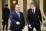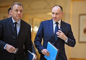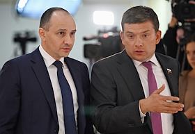 An extraordinary meeting of the Federation Council (FC) of Russia to discuss candidates for the posts of heads of the Russian law enforcement agencies and the Russian Ministry of Foreign Affairs. Candidate for the post of Chairman of the Accounts Chamber of Russia Boris Kovalchuk (left) and Deputy Chairman of the Federation Council of Russia Nikolai Zhuravlev (right) before the start of the meeting.