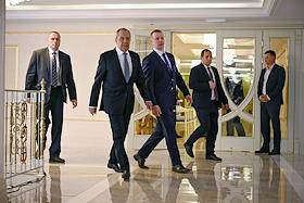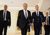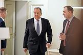 An extraordinary meeting of the Russian Federation Council to discuss candidates for the posts of heads of law enforcement agencies and the Russian Ministry of Foreign Affairs. Candidate for the post of Russian Foreign Minister Sergei Lavrov (center) before the start of the meeting.