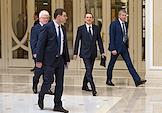 An extraordinary meeting of the Russian Federation Council to discuss candidates for the posts of heads of the Russian law enforcement agencies and the Russian Ministry of Foreign Affairs. Candidate for the post of Russian Defense Minister Andrei Belousov (second from left) and candidate for the post of manager of the Federal Service of the National Guard Troops of Russia - Commander-in-Chief of the Russian National Guard Troops (Rosgvardia) Viktor Zolotov (center) before the start of the meeting.