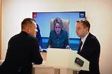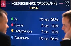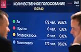 An extraordinary meeting of the Federation Council (FC) of Russia to discuss candidates for the posts of heads of law enforcement agencies and the Ministry of Foreign Affairs of Russia. Genre photography. The voting results of members of the Federation Council of Russia on the TV screen in the lobby of the building.